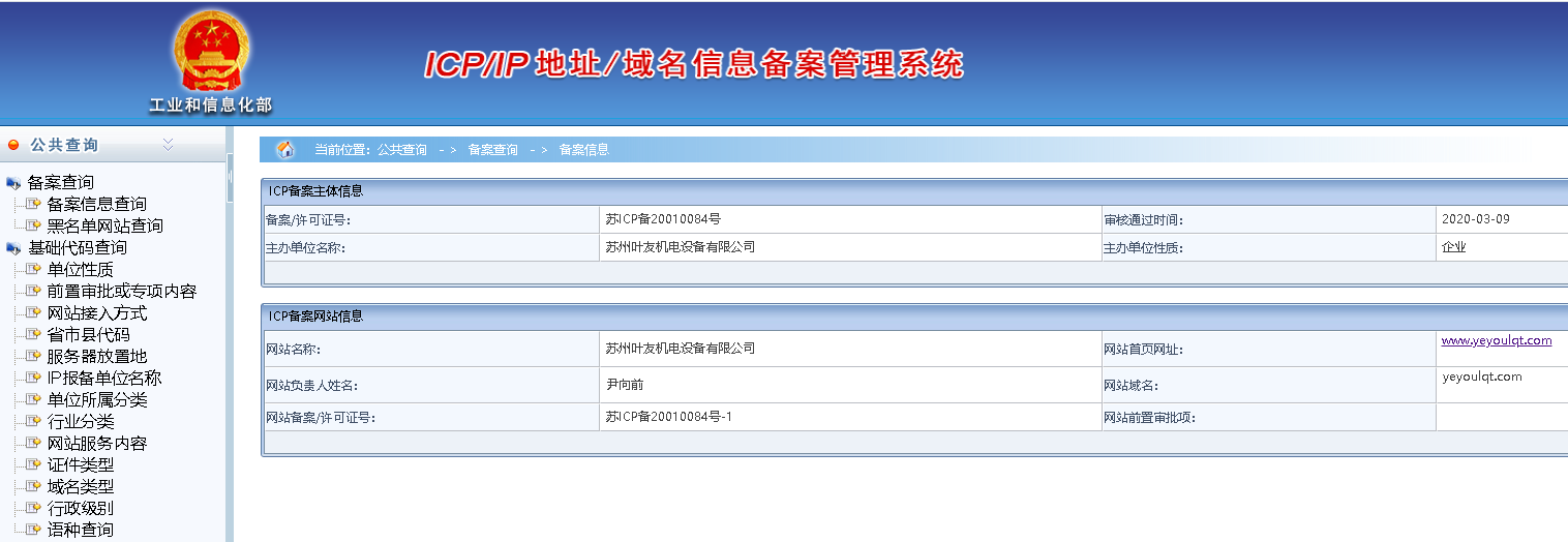 經過一周多時間蘇州葉友機電設備有限公司網站終于備案成功!備案號: 蘇ICP備20010084號-1工信部 http://www.beian.miit.gov.cn/